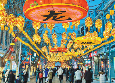 2月9日,游客在喜庆热闹的黑龙江哈尔滨市中央大街游玩。 |