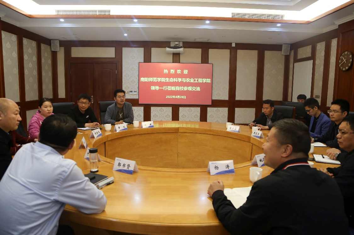 在南阳职业学院站,党委副书记郭书贤和付中欣带领仲景中医药与健康学院负责同志与我们展开了座谈,介绍了南阳职业学院的发展情况,并就下一步合作共建实习实训基地提出了构想。杨涛书记和姚伦广院长也介绍了我院的师资力量和办学优势,同时也诚挚邀请南阳职业学院的同行来我院再实地考察、洽谈深度合作。随后,杨涛一行到河南自然之道生物工程有限公司和西峡县锦澎食品有限公司进行了实地调研考察,深度了解了企业的技术需求和人才需求情况,签署了校企合作框架协议,并为公司授“南阳师范学院大学生就业实习基地”的牌匾。