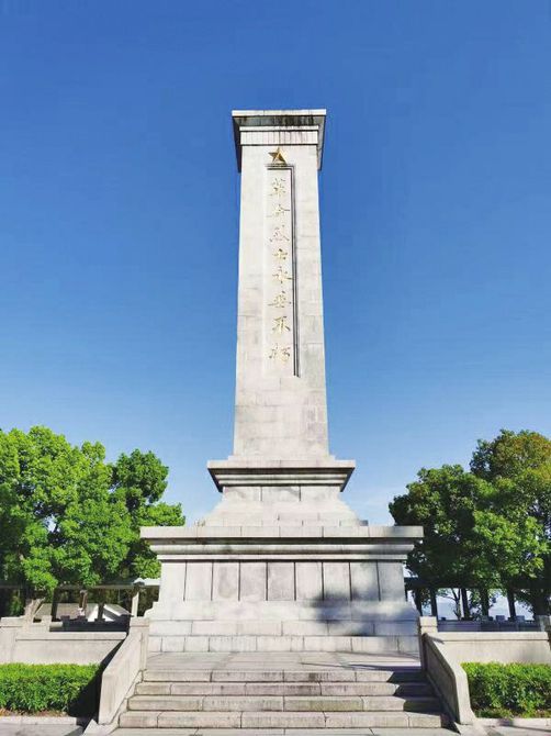 四明山位于浙江省东部的宁绍地区,平均海拔700米左右,主峰金钟山海拔1018米。因其大俞山峰顶有个“四窗岩”,日月星光可透过四个石窗洞照射进去,故称“四明山”。在余姚市梁弄镇西侧有座狮子山,四明山革命烈士纪念碑就坐落在这里。纪念碑高18.5米,用花岗石垒砌,雄伟挺拔,碑正面为郭沫若题写的“革命烈士永垂不朽”八个镏金大字;碑背后刻有余姚市委市政府敬题的“抗日战争时期解放战争时期浙东地区为革命英勇献身的烈士永垂不朽”。碑基四周有两层平台,广场面积3600平方米。从山脚停车场到纪念碑,共有七层319级台阶。进入陵园正大门,两侧有大方柱两根,柱上有“生的伟大,死的光荣”对联。从下往上第三层台阶前,立有红色旗状石碑,上刻毛泽东语录:“成千成万的先烈,为着人民的利益,在我们的前头英勇地牺牲了,让我们高举起他们的旗帜,踏着他们的血迹前进吧!”再往上经过四层台阶,就进入了纪念碑广场。