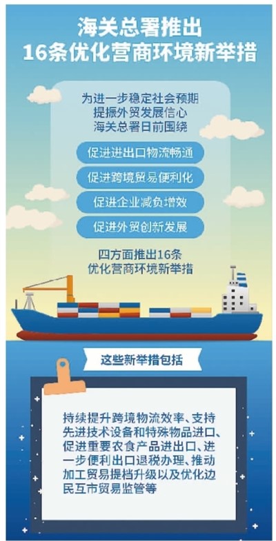 本报记者 王俊岭 进出口物流畅通,贸易才能繁荣。6月12日,海关总署在自身职责范围内推出了持续提升跨境物流效率、促进重要农食产品进出口、进一步便利出口退税办理等优化营商环境16条举措(简称“16条”),进一步稳定社会预期,提振外贸发展信心。近一个月来,相关便利化通关举措在各地落实情况如何?给外贸企业带来哪些利好?为外贸发展积聚了哪些新动能?