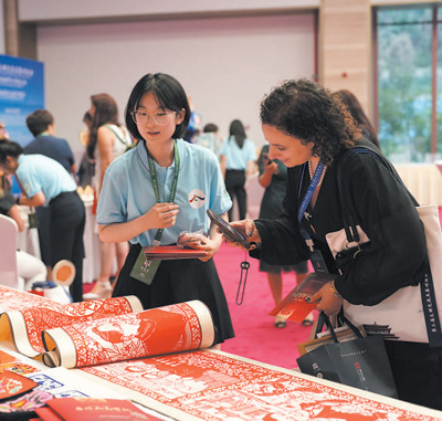 7月3日,智利汉学家马塔(右一)在第三届文明交流互鉴对话会暨首届世界汉学家大会上欣赏青葫芦立体书。 |