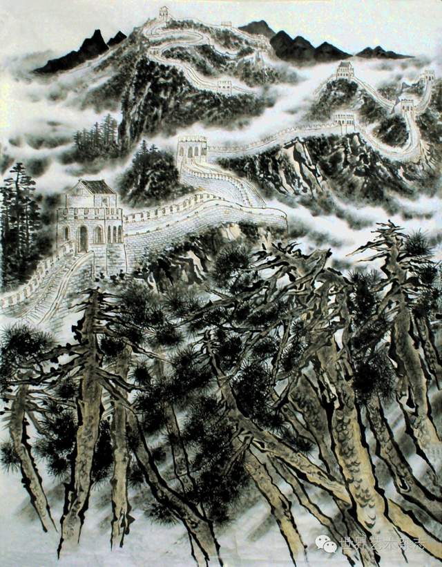 这幅长城雄姿以“思接千载,视通万里”的激情,描绘屹立千年的长城雄姿,追求象征民族精神的博大雄浑和审美感情的壮美崇高,大胆地进行了笔墨语言和图式的创造。在气势磅礴的境象中,用线更为有力,用墨更为凝重,皴擦更为苍厚,一切都蒙上了天人合一的静气,一切都显露出沉淀历史的沧桑感,一切都蕴含着古貌新机的生命力,注入了让人感奋的精神力量。
