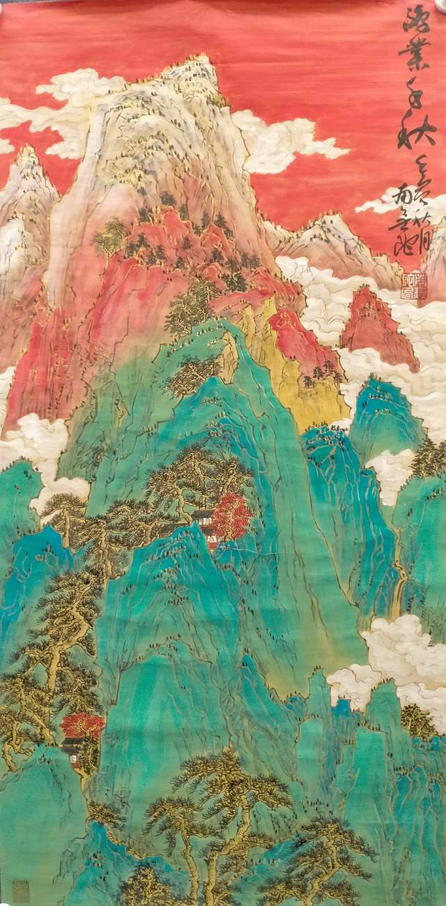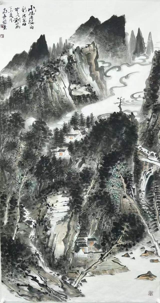 南景黎的青绿山水,讲究画面格局的雄浑、奇犷、丰盈,泼墨施色厚重、泼辣、老拙,同时强化线条的表现力和抒情性,很有清代著名画家龚贤的气象与风韵。他的笔墨以厚重为主要特色,落笔有力,用墨有厚度感,透明感和层次感,富有浓淡干湿的变化。他追求的厚重是含蓄而不外张,润泽而不失苍劲,他十分注重水墨语言的程式之美,使作品既能厚重也能清逸和空灵。