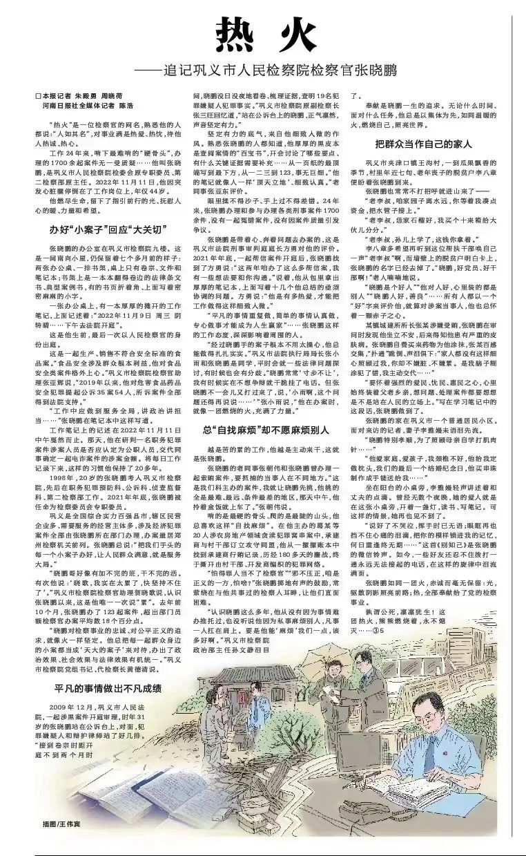 “晓鹏对检察事业的忠诚、对公平正义的追求,就像火一样坚定。他总把每一起群众身边的小案都当成‘天大的案子’来对待,办出了政治效果、社会效果与法律效果有机统一。”巩义市检察院党组书记、代检察长黄德清说。