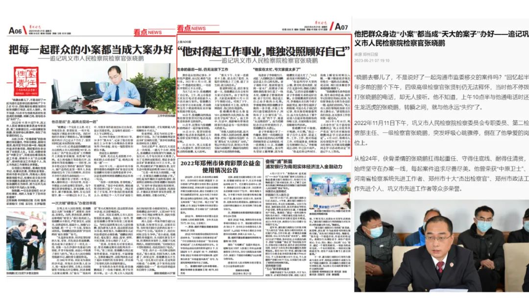 2023年6月21日,《河南日报》5版刊发《热火——追记巩义市人民检察院检察官张晓鹏》,《郑州日报》2版头条、《郑州晚报》6版、7版两个版面、郑州广播电视台、正观新闻、中原网等多家媒体分别报道了张晓鹏的事迹,在社会上引起了广泛关注。