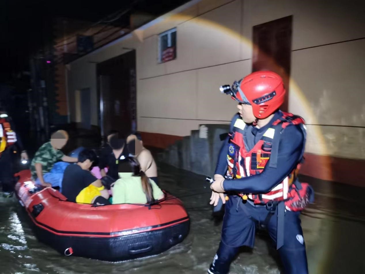 ▲在北京房山,救援队员连夜搜救转移被困人员