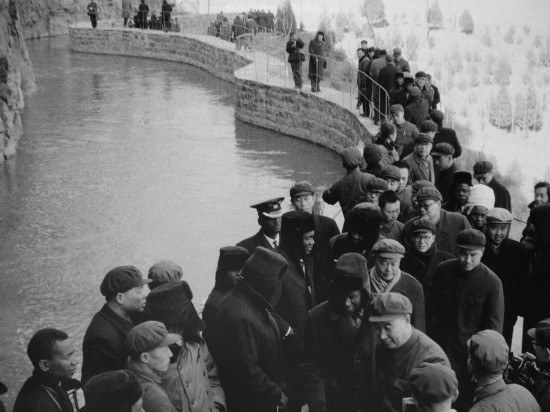 红旗渠建成后,各地来宾参观红旗渠。
