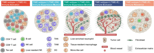 研究人员根据免疫细胞的状态,首次在单细胞层面的精度上,总结提出五种免疫微环境亚型(TIMELASER),分别是:免疫激活型、髓系富集免疫抑制型、基质富集免疫抑制型、免疫排斥型、免疫驻留型。