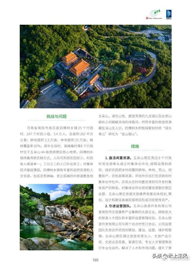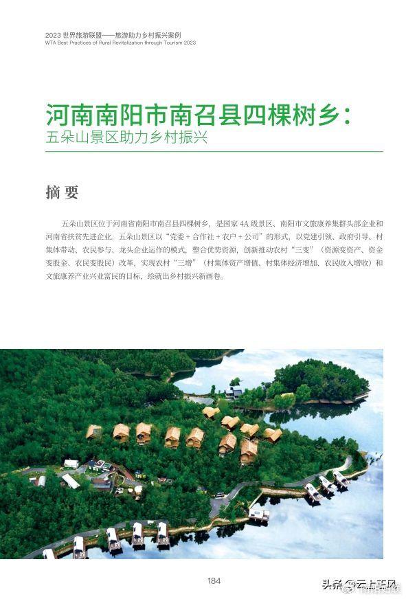 11月15日,主题为“旅行的力量——向更美好的未来出发”的2023世界旅游联盟·湘湖对话在杭州开幕。世界旅游联盟与联合国世界旅游组织联合发布了《2023世界旅游联盟——旅游助力乡村振兴案例》。其中《河南南阳市南召县四棵树乡:五朵山景区助力乡村振兴》作为案例入选。